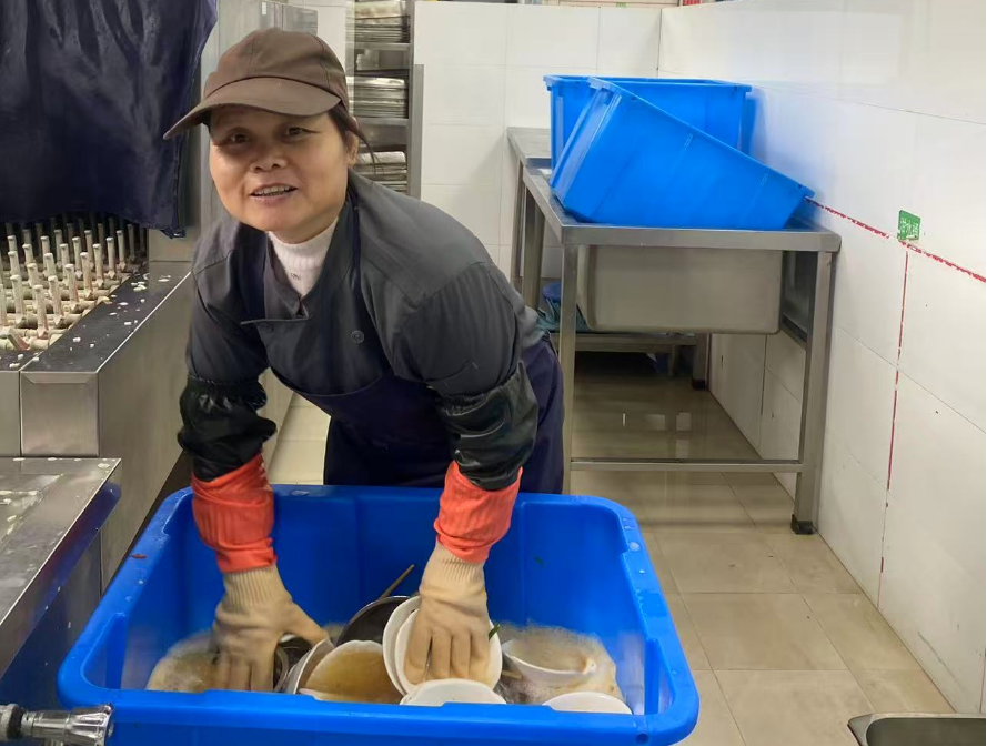 刘万丽,入职以来爱岗敬业,负责食材分拣、清洗切配、餐具消毒、环境保洁等工作,严守安全规范,不留死角,是大家公认的“标兵”。